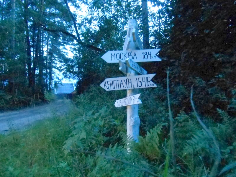 Указатель направлений у поворота к дачному посёлку. Есть Москва, Санкт-Петербург, Екатеринбург, Париж, Владивосток, Кейптаун.