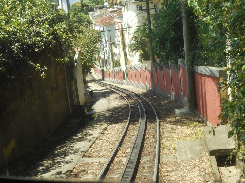 Поездом до нижней станции, затем пешком через горный «перевал» и небольшой автомобильный тоннель к конечному пункту трамвайной линии Santa Theresa. На первый взгляд трамвайная линия показалась недействующей, начинаю двигаться вдоль неё пешком. Но вскоре со стороны центра города показался двухосный трамвайный вагон, стилизованный под старину. Бегу к конечному пункту, сажусь в вагон, который не имеет окон и дверей.