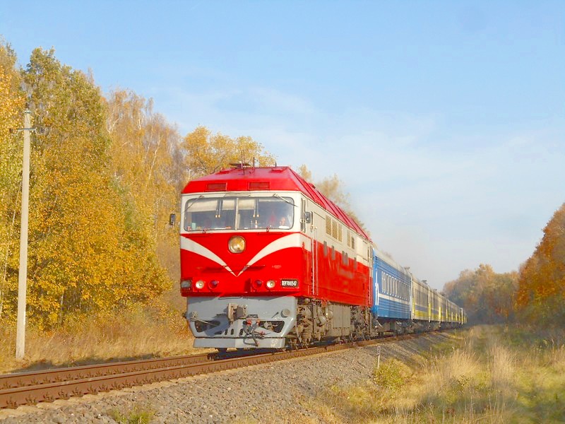 Украинский пассажирский поезд (первый вагон - белорусский) следует из Риги в Киев. Перегон Губерния - Мешкуйчяй.