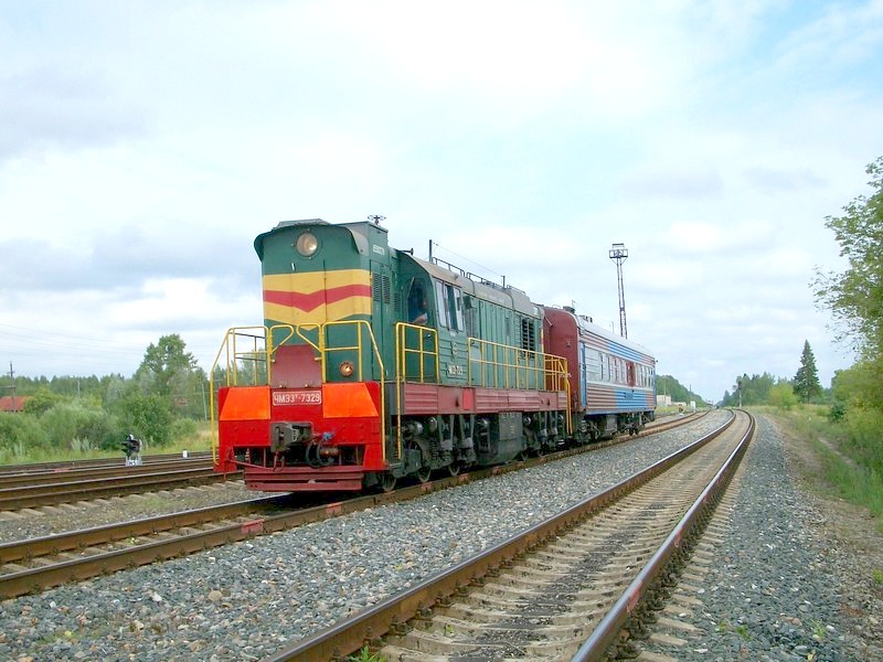 Волосатая. Вслед за пригородным поездом прибыл спецпоезд — тепловоз ЧМЭ3 с вагоном-путеизмерителем.