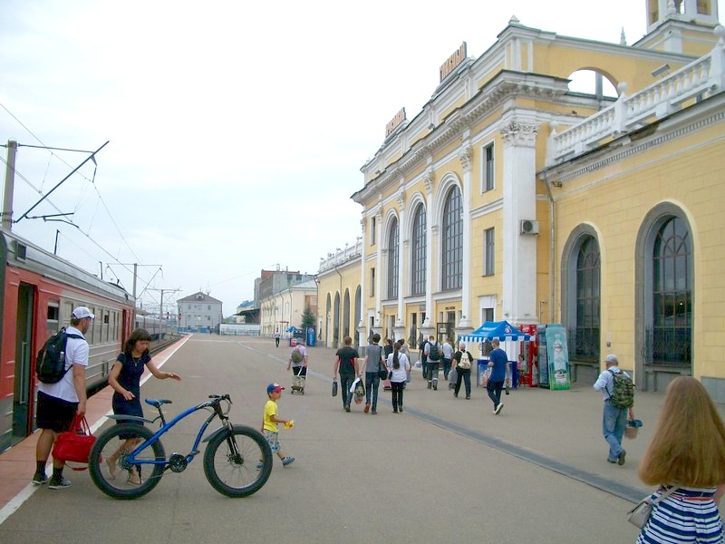 Станция Ярославль-Всполье. Граждане везут велосипед с гигантскими колёсами.
