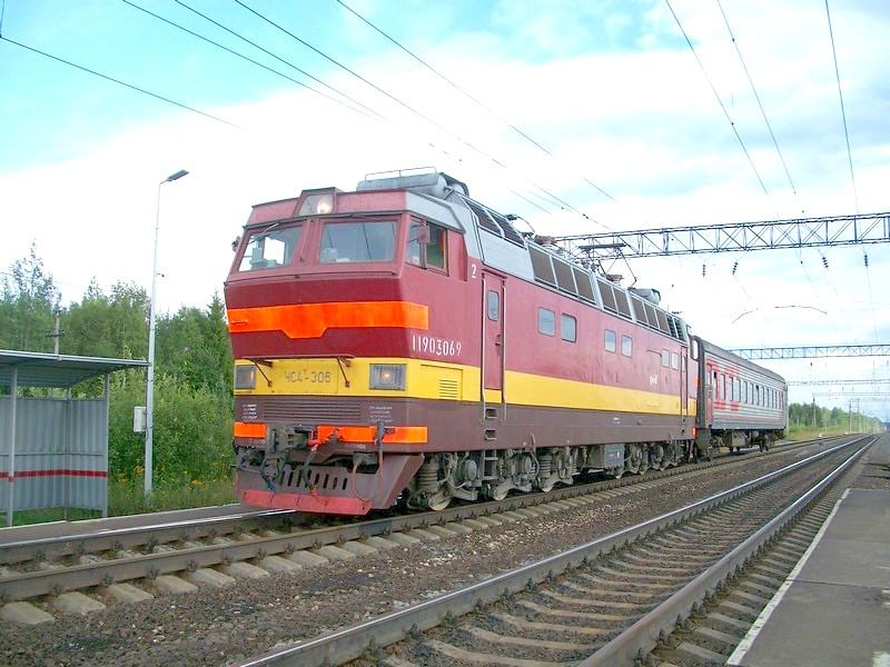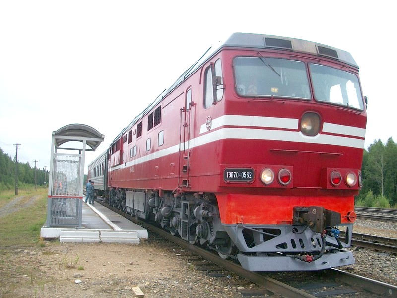Отдыхаю в Лухтонге. Вечерним пригородным поездом Коноша — Вожега — до Вожеги. Поезд состоит из электровоза ЧС4Т и одного пассажирского вагона, идёт очень поздно.