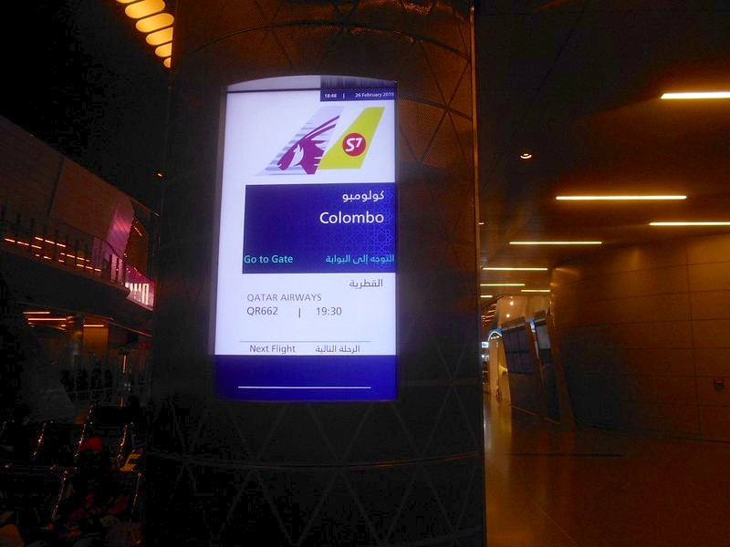 Попадание: два перелёта авиакомпанией «Qatar Airways», Москва-Домодедово — Доха и Доха — Коломбо. В Дохе — предельно короткая пересадка, надо быстро перебежать. На обратном пути будет более длительная, три часа, но выходить в город не буду. Железной дороги в стране нет, хотя название страны совпадает со словом «поезд» на арабском (вариант записи qitar, но арабские слова часто неоднозначно записываются латиницей, в азербайджанском однозначно qatar). Как появится (скоро: https://en.wikipedia.org/wiki/Qatar_Rail ), так и посещу.