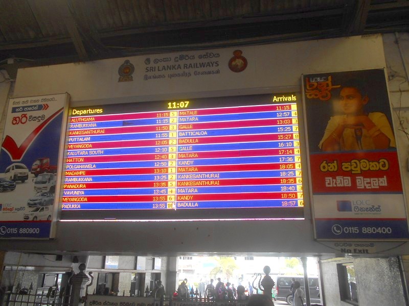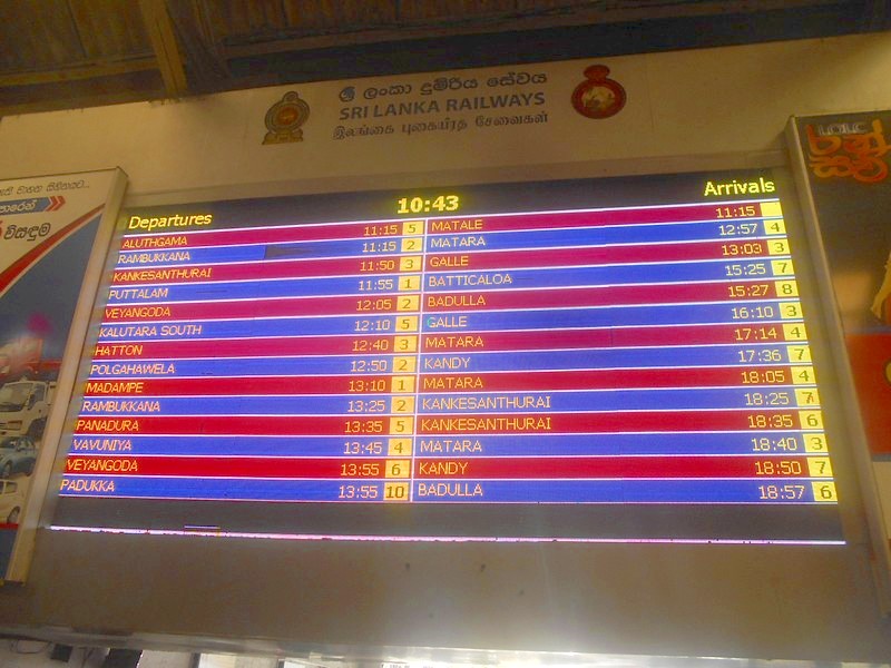 Станция Colombo Fort. Электронное табло с ближайшими поездами. Мой поезд — на Matale в 10:35.