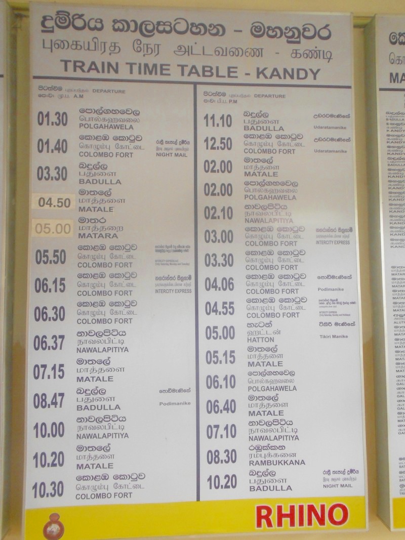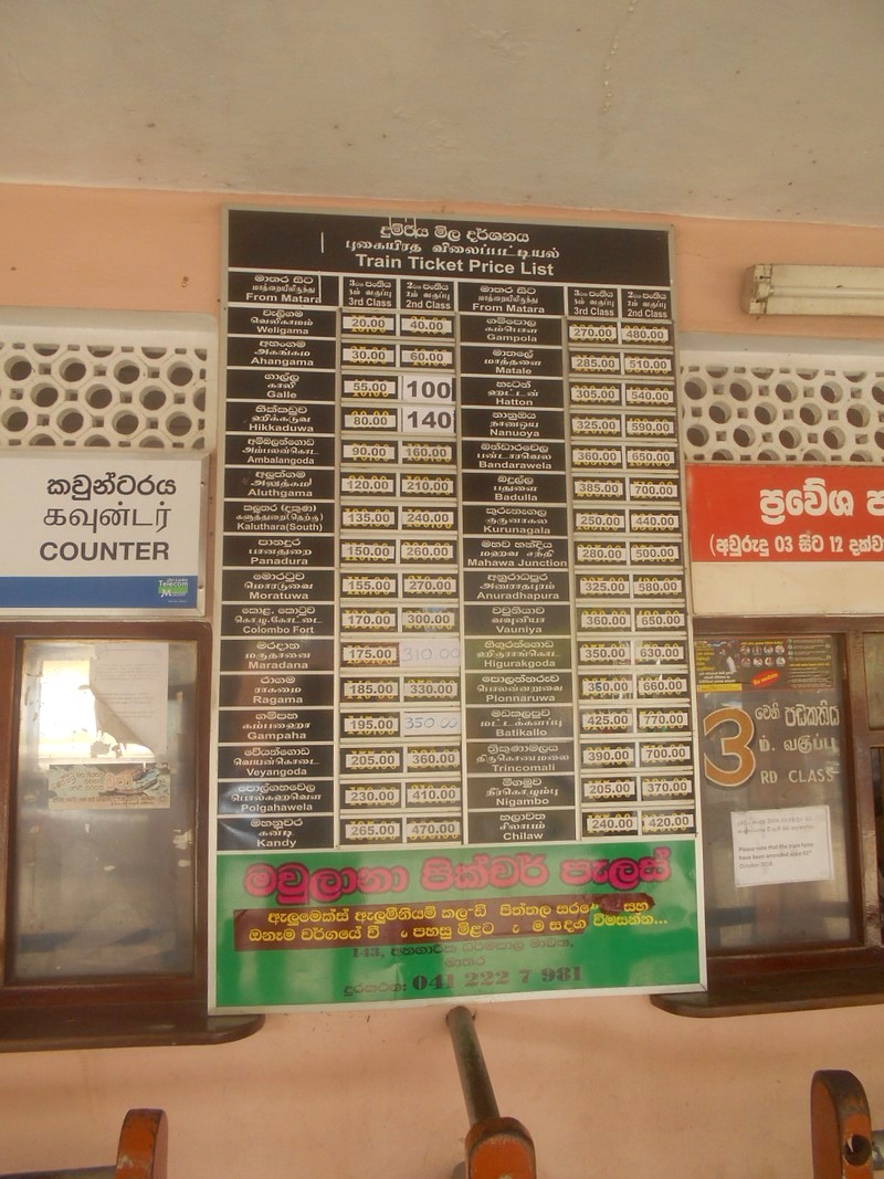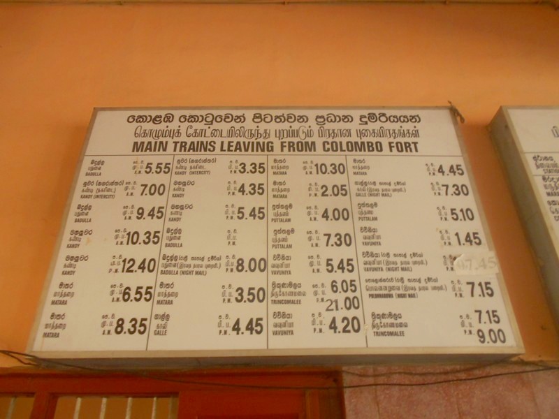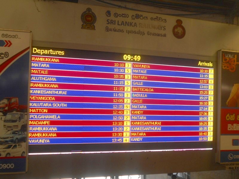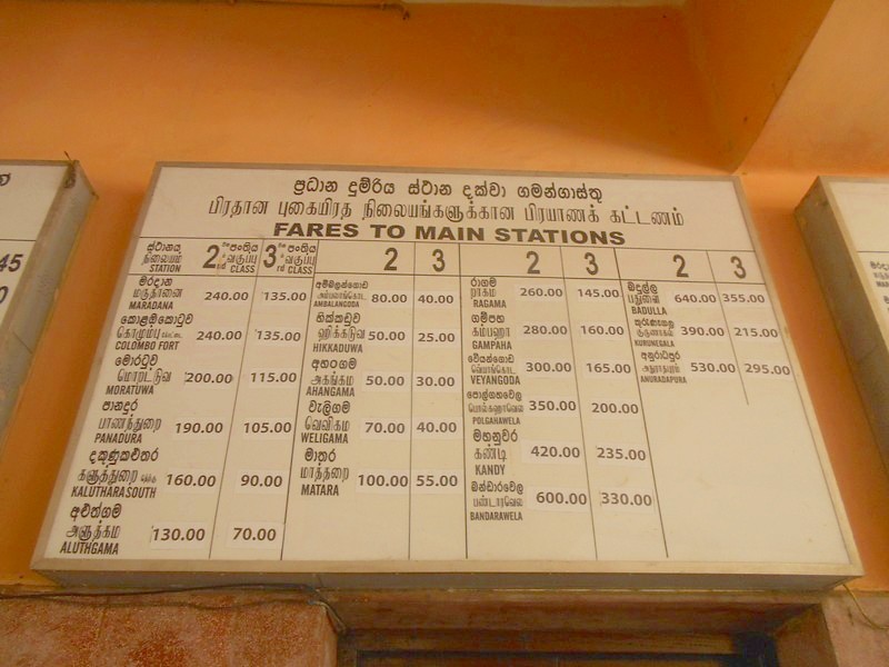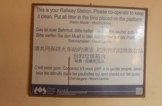Немалая часть информации — только на сингальском языке (основной язык Шри-Ланки). Письменность нечитаема, цифры «наши». Но английский язык на железной дороге почти все знают. Вообще, уровень его распространённости в стране высок, хотя статуса государственного языка у него нет.