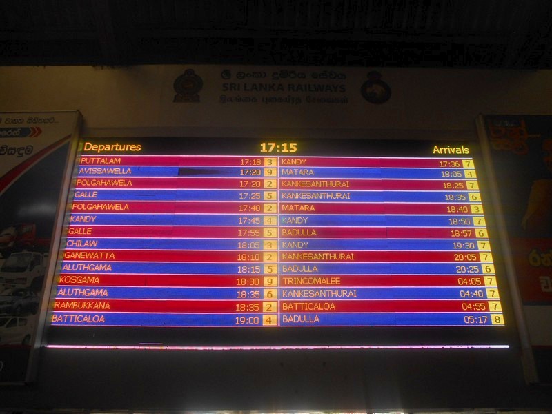 Коломбо-Форт. Электронное табло с отображением ближайших поездов. В большинстве случаев корректно.