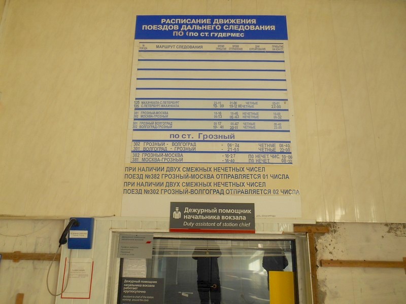 Тут два поезда, на Волгоград и на Москву, каждый раз в два дня. На московский поезд, я думаю, любой нормальный человек будет садиться на станции Червлённая в тридцати километрах от города. Это не только позволит избежать постыдного досмотра, но и сэкономит время. Из Грозного поезд отправляется в 16:25, из Червлённой в 19:34, тогда как ехать до неё из центра города минут сорок. (вероятно, только на такси).