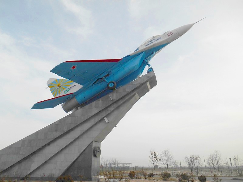 Аэропорт Магас в городе Сунжа (Слепцовск). Перед аэровокзалом установлен боевой самолёт МиГ-29,