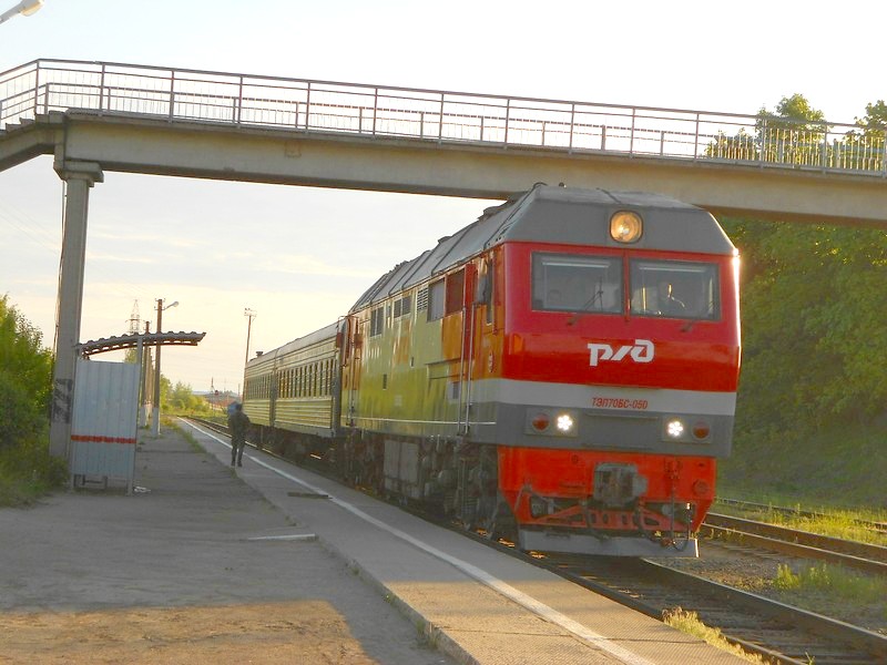 Станция Тейково. Прибывает поезд Иваново — Александров. Тепловоз ТЭП70БС-050 и два вагона, пассажиров