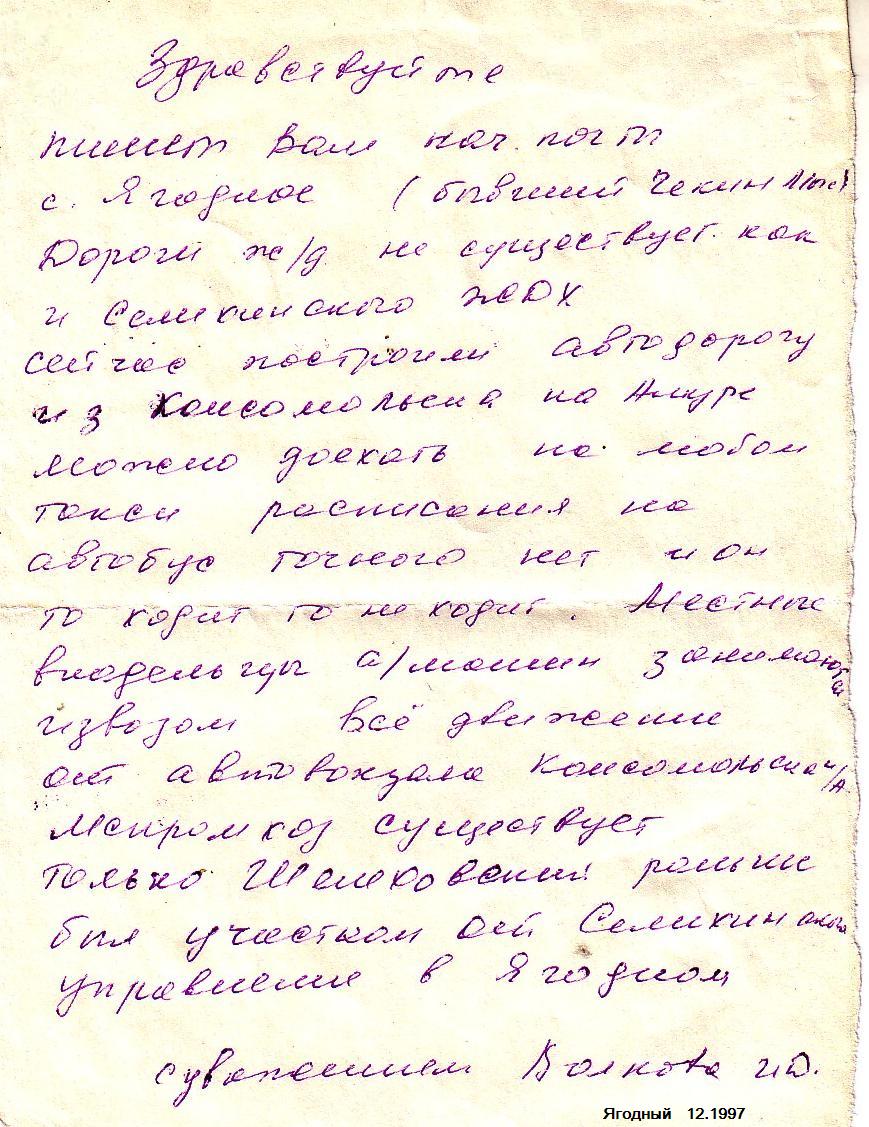 железной дороги Селихин — Ягодный). Декабрь 1997 года.
