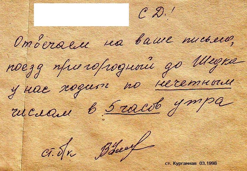 Ответ старшего билетного кассира станции Курганная, Краснодарский край (о движении поездов на Шедок). Март 1998 года.