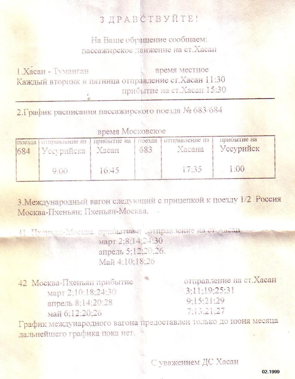 Ответ начальника станции Хасан, Приморский край (о движении пассажирских поездов). Февраль 1999 года.