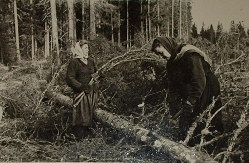Удимская узкоколейная железная дорога. Обрубка сучьев в лесу. 1950-е годы (?).