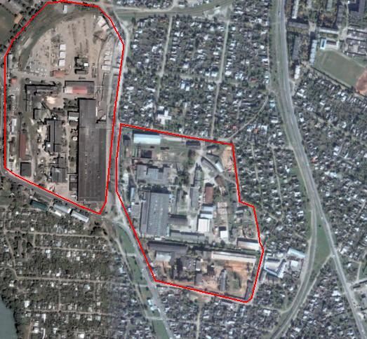 Территория завода на спутниковом снимке (источник — «Google Maps», ориентировочная дата съёмки — 2005 год)