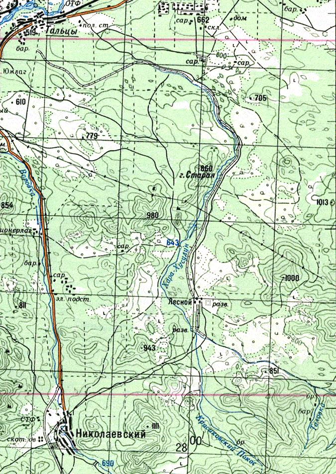 Район местонахождения узкоколейной железной дороги на топографической карте масштаба 1:100 000,