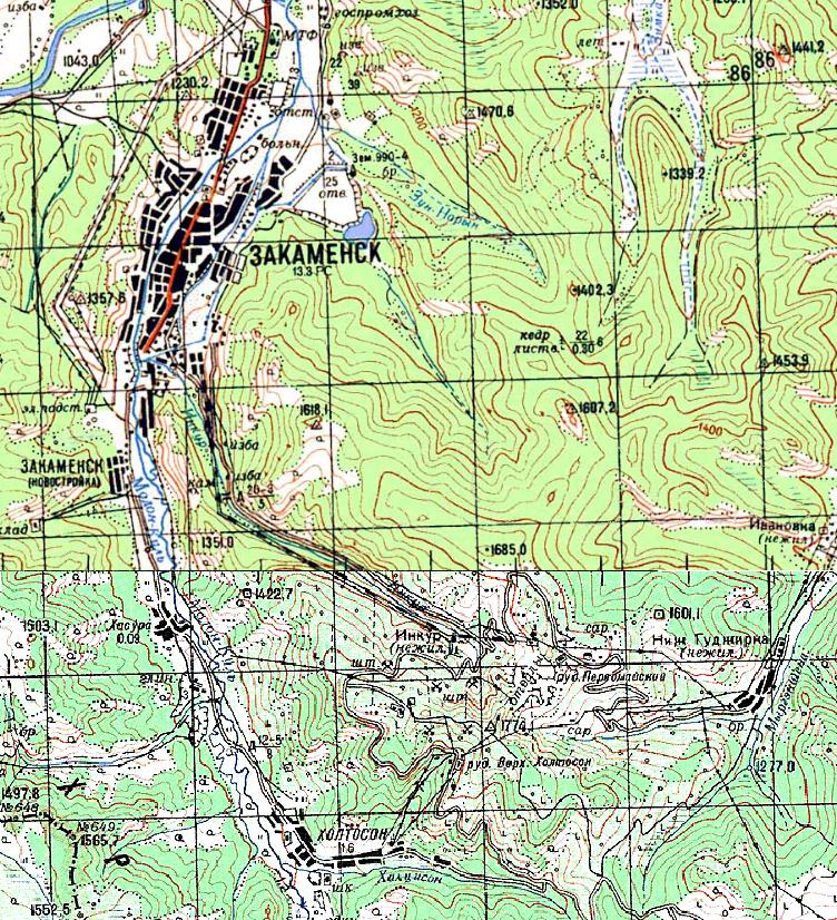изданной в 1984 году (северная часть), 1982 году (южная часть). Город Закаменск (первоначально — посёлок Джидастрой) возник в 1932 году с связи с началом разработки месторождения вольфрамо-молибденовых руд. Главным предприятием города является Джидинский вольфрамо-молибденовый комбинат. На комбинате действовало несколько шахт (подземных рудников), на них имелись шахтные узкоколейные железные дороги. Одна из узкоколейных железных дорог имела наземный участок относительно большой протяжённости, связывавший рудник Холтосон с обогатительной фабрикой. В 1958 году на участке рудник Холтосон — обогатительная фабрика узкоколейная железная дорога была заменена канатной дорогой.