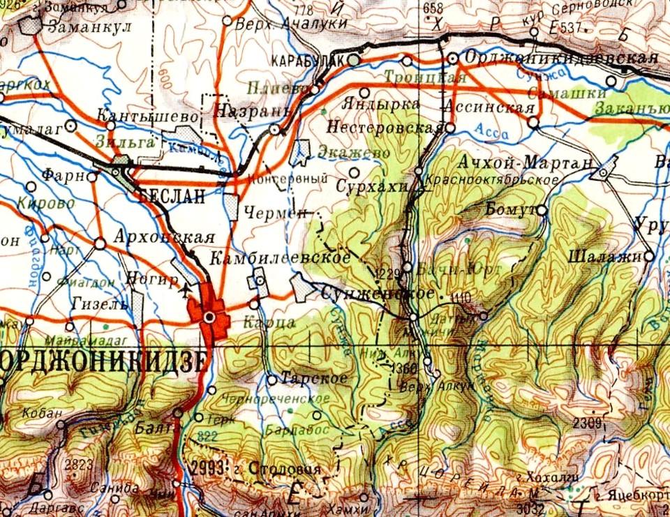 Сунженская (?) узкоколейная железная дорога. Начальный пункт — станица Оржоникидзевская (Слепцовская), расположенная вблизи станции Слепцовская на железнодорожной линии Прохладная — Гудермес.