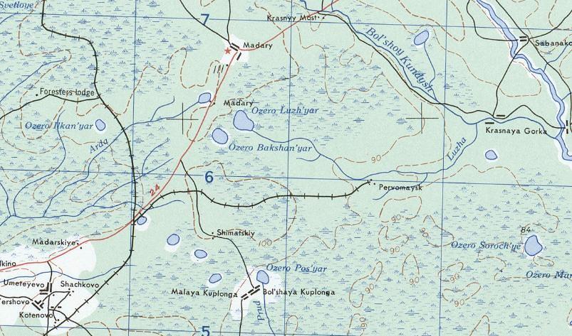 изданной в 1990 году (нанесена условно). Узкоколейная железная дорога на топографической карте масштаба 1:100 000, изданной в 1978 году (нанесена условно)