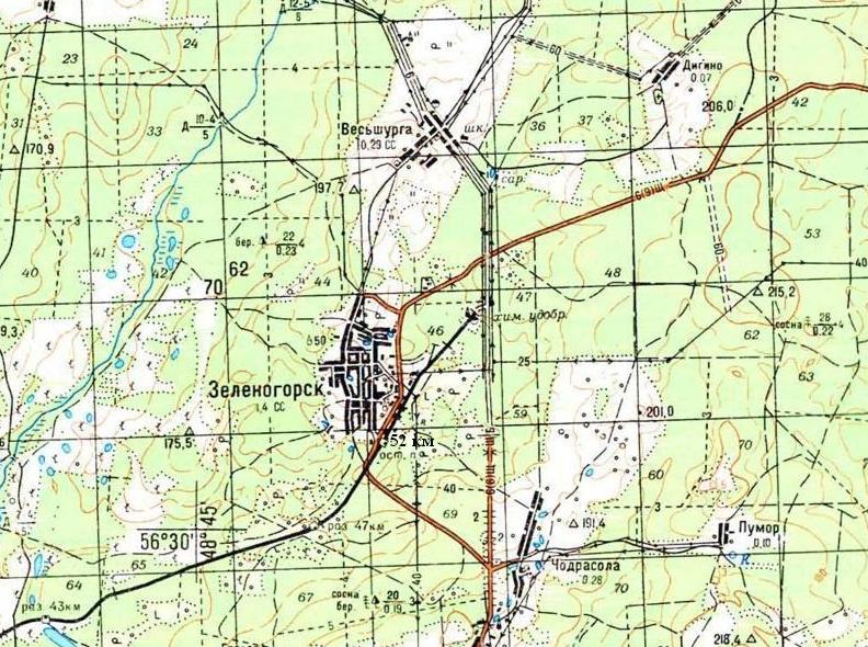 Узкоколейная железная дорога на топографической карте масштаба 1:200 000, изданной в 195? году.