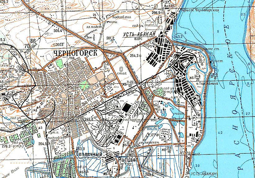 изданной в 1992 году (узкоколейная железная дорога не обозначена). Город Черногорск (до 1936 года посёлок Каратигей) является центром Минусинского угольного бассейна. Массовая добыча угля здесь ведётся с начала XX века.