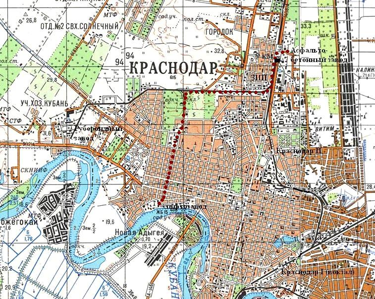 изданной в 1988 году (нанесена условно). Краснодарский спиртовой завод (первоначальное название — виноградный завод «Первенец Кубани») был открыт в 1871 году. По информации от Р. Лысянского, в 1930-х годах спиртовой завод был связан узкоколейной железной дорогой с разъездом 9 километр магистральной железной дороги (ныне — северные парки грузовой станции Краснодар II). Узкоколейная железная дорога использовалась не только для грузовых, но и для пассажирских перевозок.