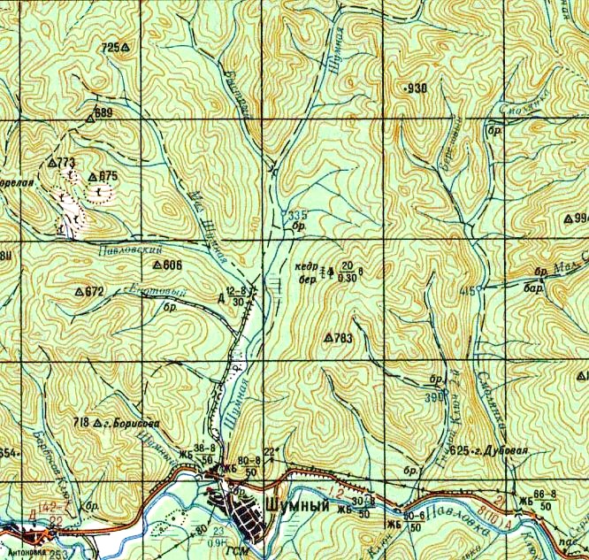 Район местонахождения узкоколейной железной дороги на топографической карте масштаба 1:100 000