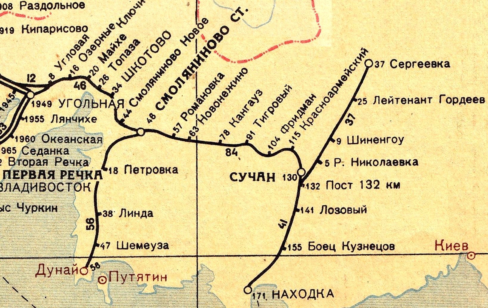 Северо-Сучанская узкоколейная железная дорога. Начальный пункт — посёлок Углекаменск (прежние названия — Тудагоу, Северный Сучан).