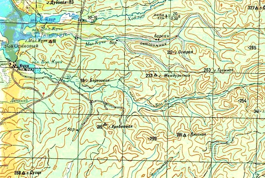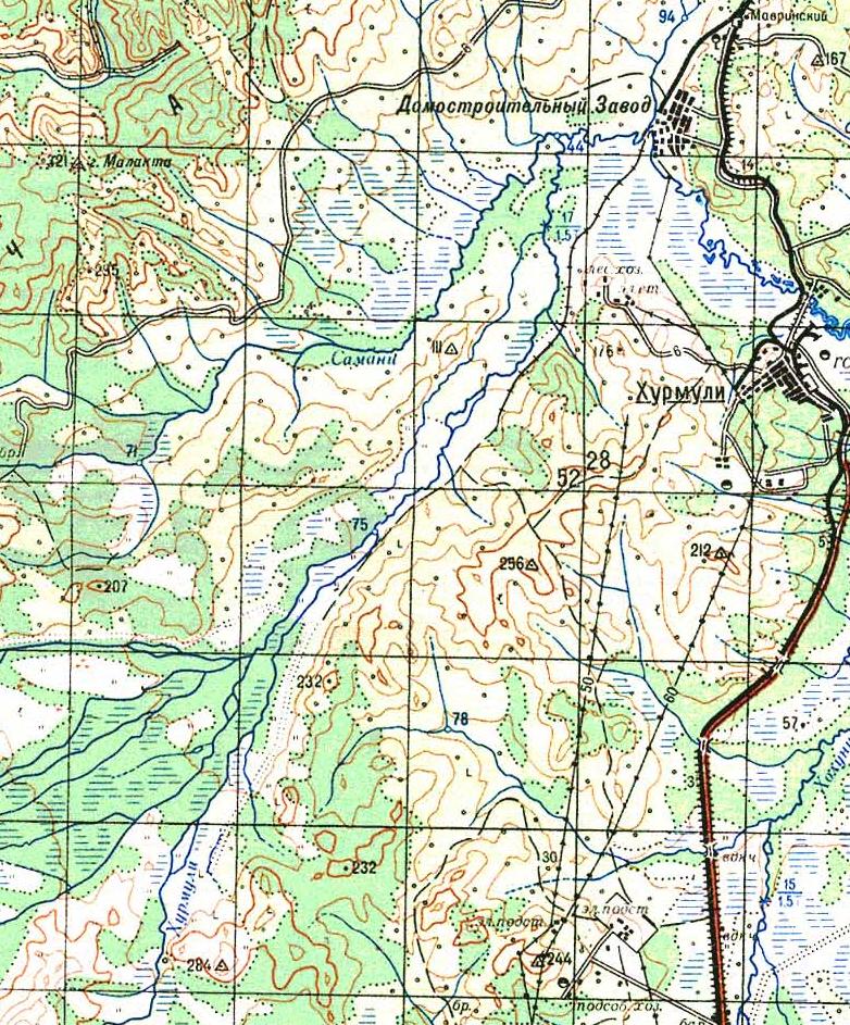 Район местонахождения узкоколейной железной дороги на топографической карте