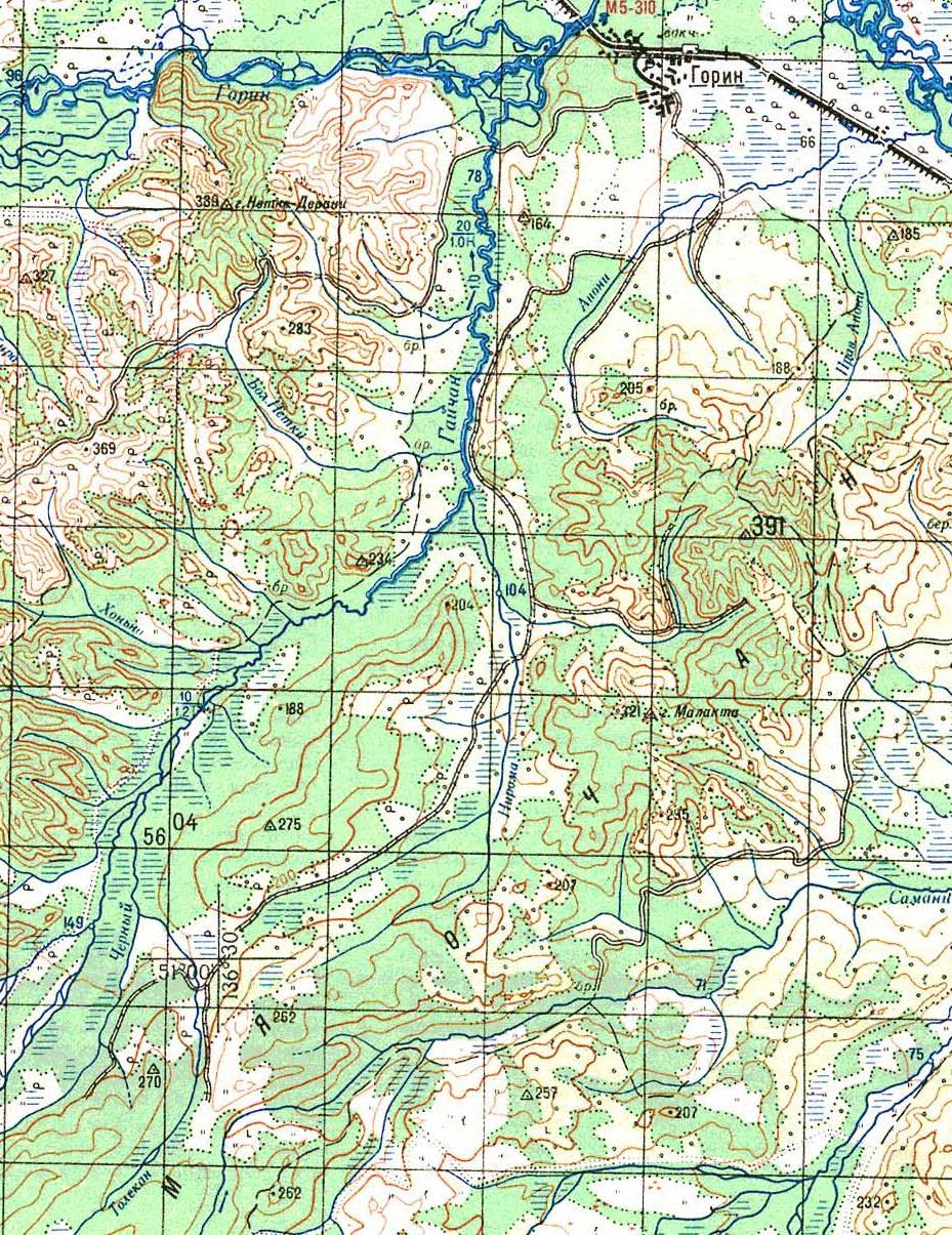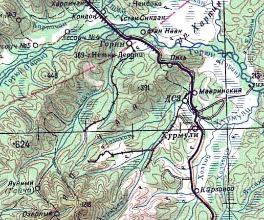Горинская (?) узкоколейная железная дорога. Начальный пункт — посёлок Горин, расположенный у станции Горин на железнодорожной линии Комсомольск-на-Амуре — Ургал.