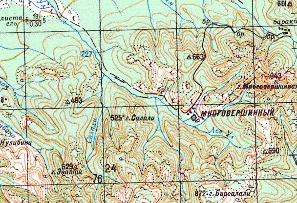 масштаба 1:200 000, изданной в 1986 году. Многовершинный ГОК производит добычу золота открытым и подземным способом. Строительство шахт и посёлка Многовершинный (одно из проектных названий — Златогорск) началось в 1970-х годах.