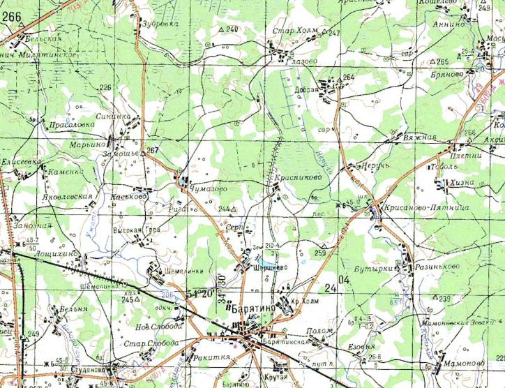 Узкоколейная железная дорога Барятинского (?) торфопредприятия. Начальный пункт — село Барятино, расположенный у станции Барятинская на железнодорожной линии Сухиничи-Узловые — Занозная.