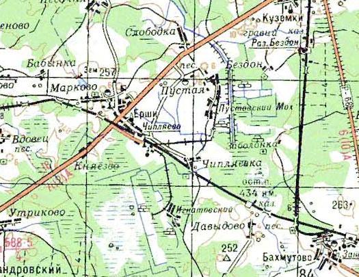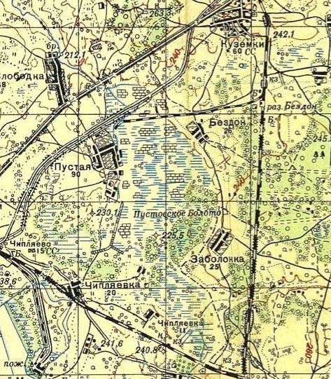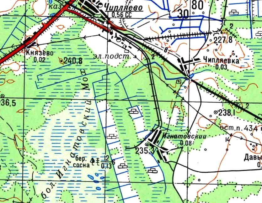 Увеличенный фрагмент предыдущей карты. Чипляевское торфопредприятие находилось в посёлке Чипляево, имело два участка — Пустовский (севернее железной дороги широкой колеи) и Игнатовский (южнее железной дороги широкой колеи). На каждом участке находились невзаимосвязанные узкоколейные железные дороги.