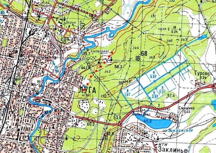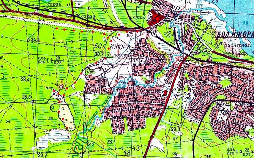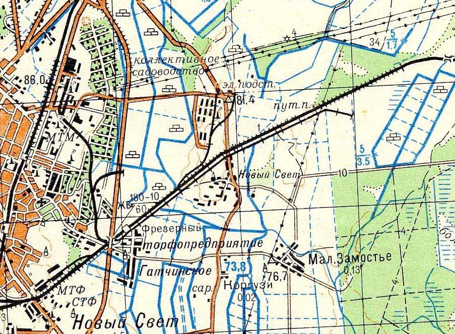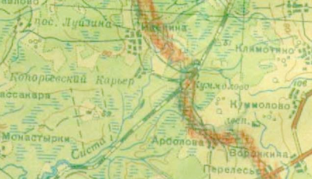 на топографической карте масштаба 1:100 000, изданной в 1978 году. В некоторых топографических картах обозначена узкоколейная железная дорога, пролегающая от станции Молосковицы в северном направлении. Протяжённость узкоколейной железной дороги, согласно картам, составляет около 1500 метров.