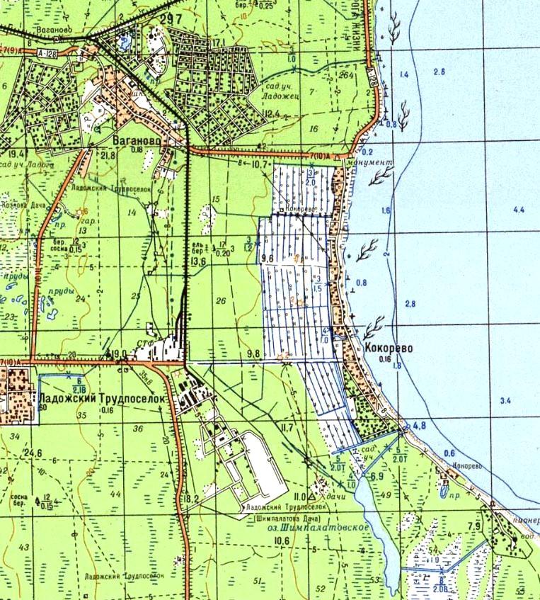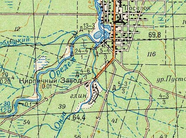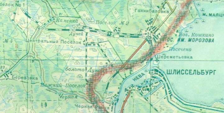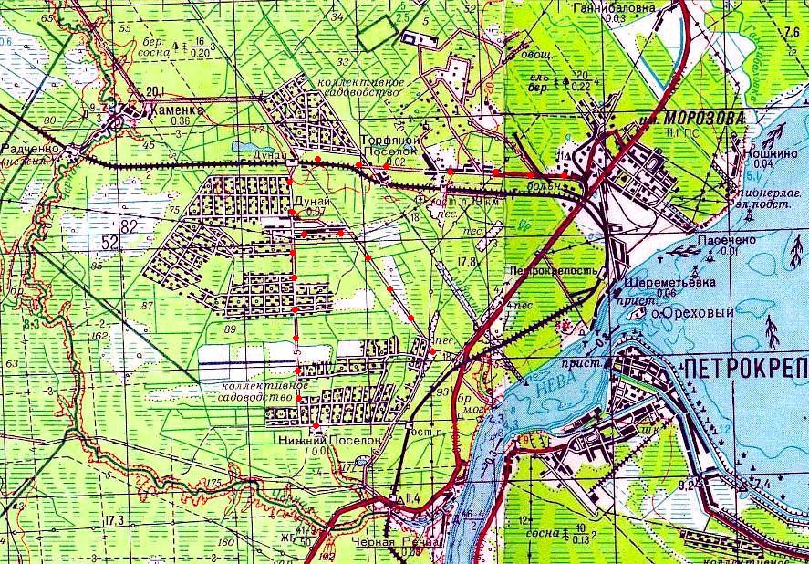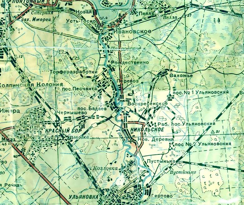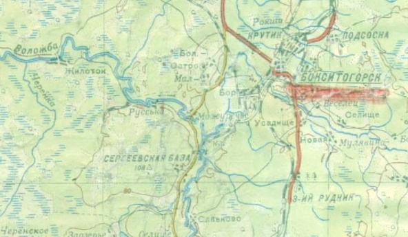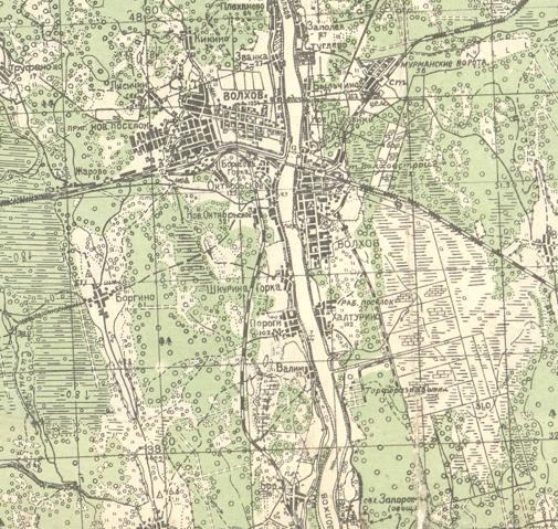 на топографической карте масштаба 1:50 000, изданной в 198? году. На некоторых топографических картах показана «узкоколейная железная дорога», ведущая от станции Тихвин в южном направлении, протяжённостью около 4 километров.