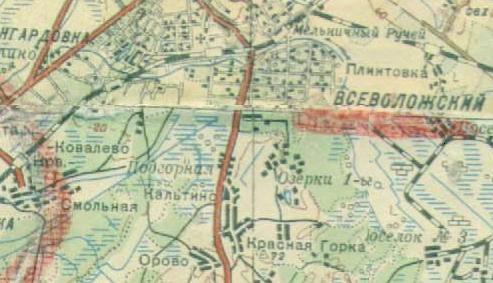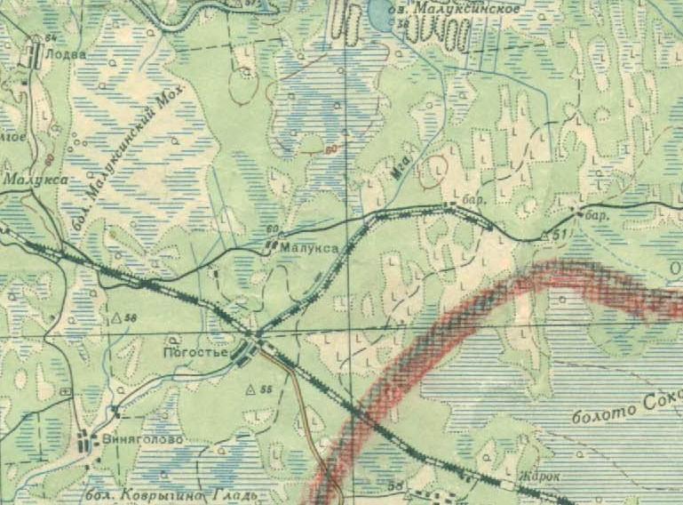 Узкоколейная железная дорога (?) в Молосковицах. Возможный начальный пункт — станция Молосковицы, расположенная на железнодорожной линии Гатчина — Веймарн.
