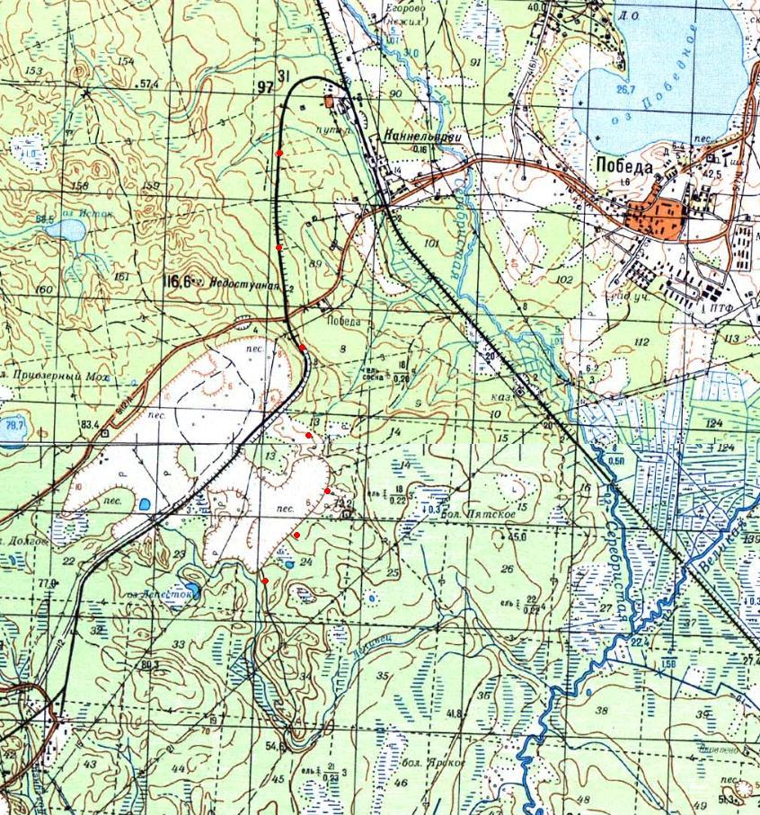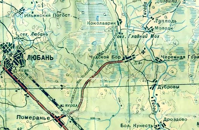 Узкоколейная железная дорога на топографической карте масштаба 1:200 000, изданной в 1942 году. Узкоколейная железная дорога на топографической карте масштаба 1:100 000, изданной в 1941 году