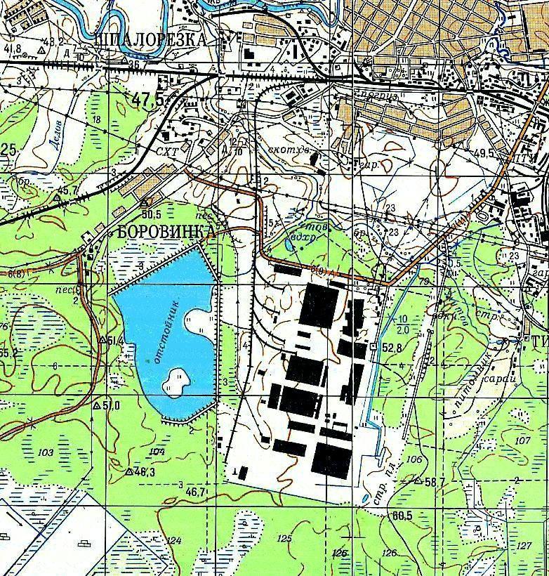 Узкоколейная железная дорога и подъездные пути широкой колеи на топографической
