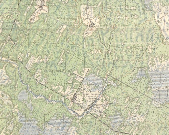 Район местонахождения узкоколейной железной дороги на топографической карте