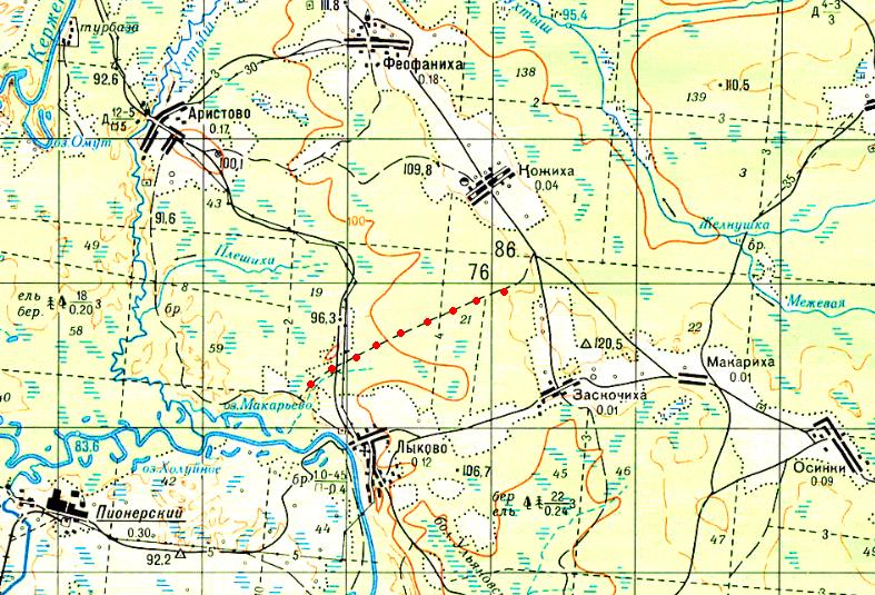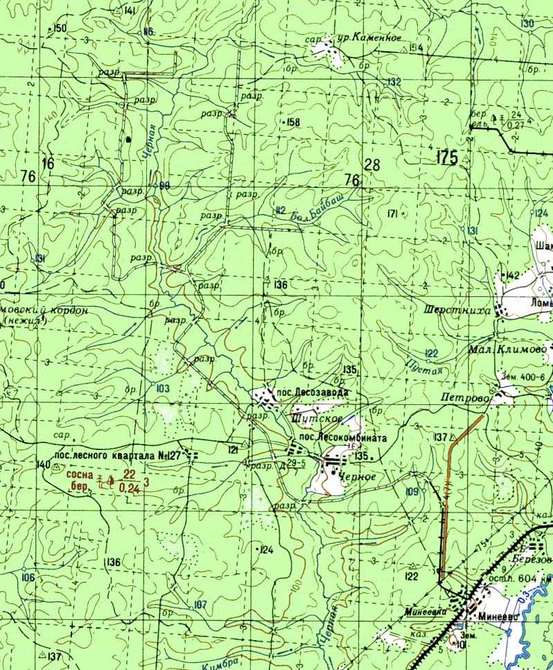 Район местонахождения узкоколейной железной дороги на топографической карте масштаба 1:100 000,