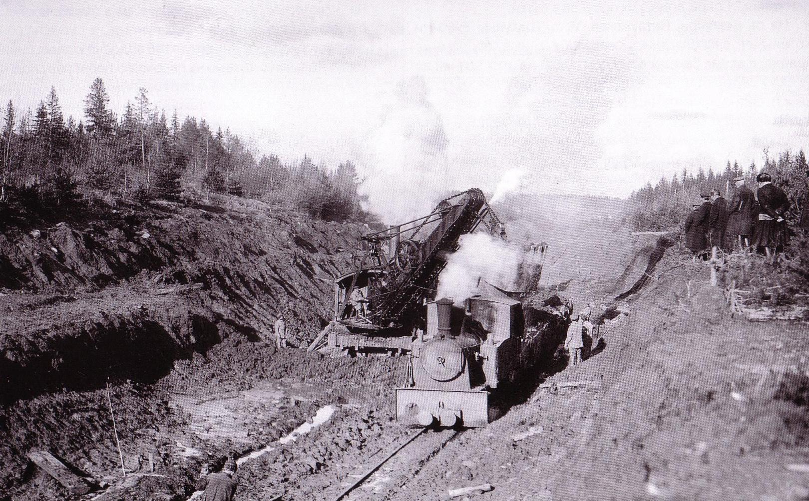 «Узкоколейный паровоз и экскаватор на строительстве линии Нижний Новгород — Котельнич. 1925 год.»