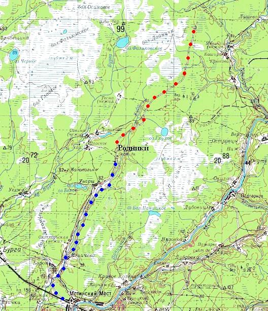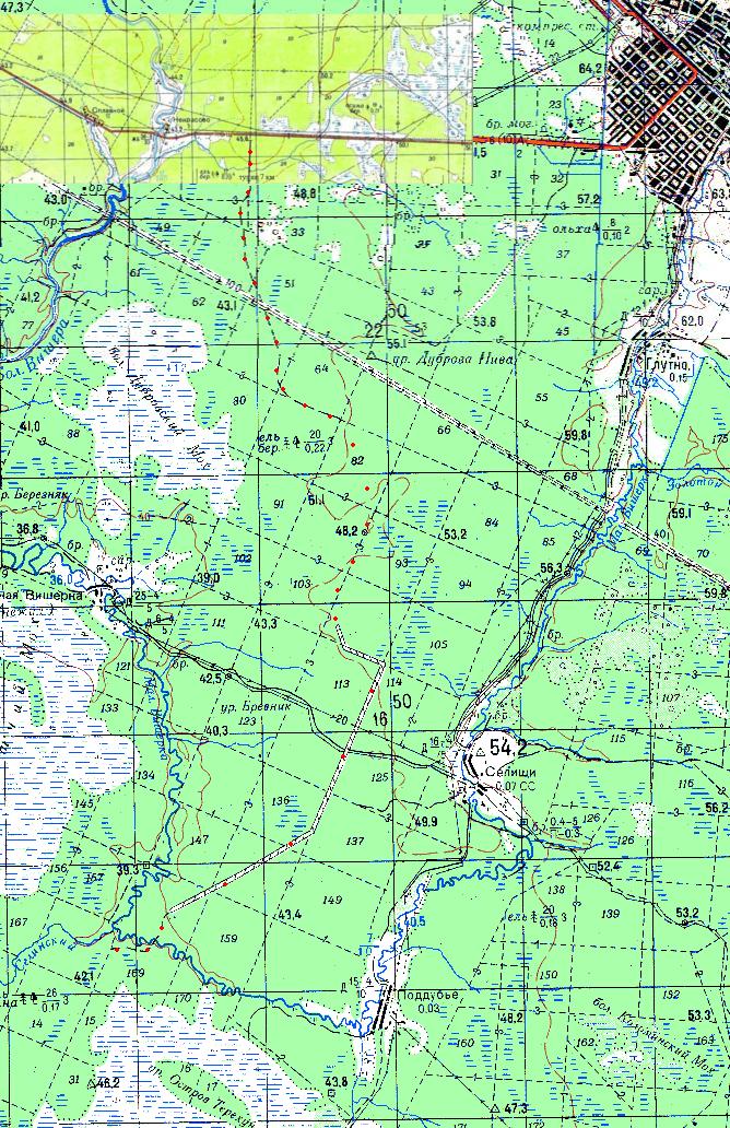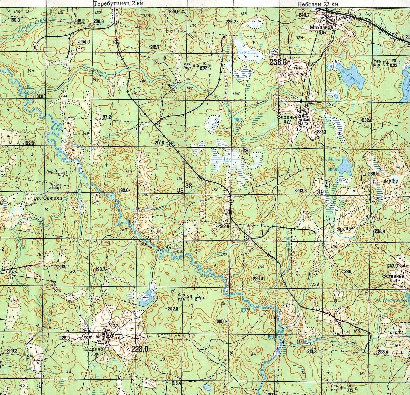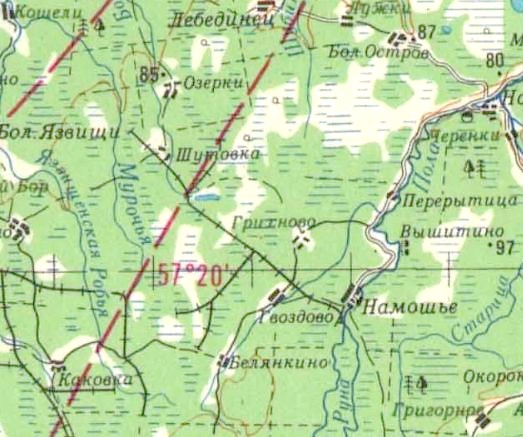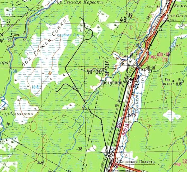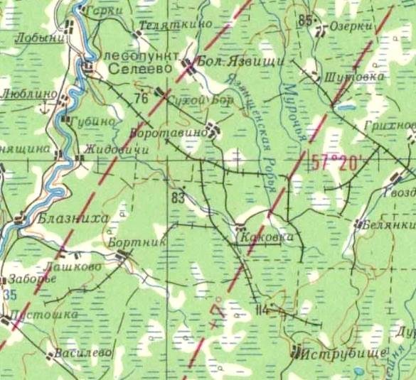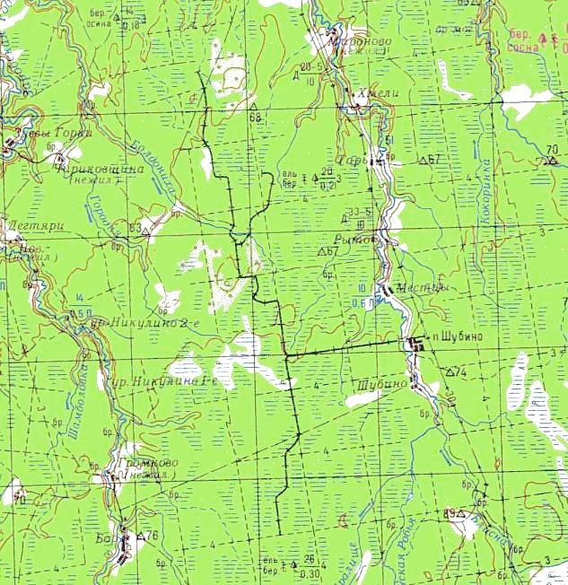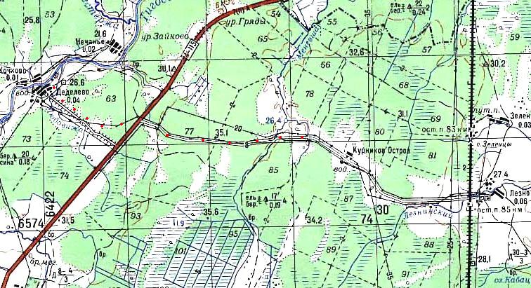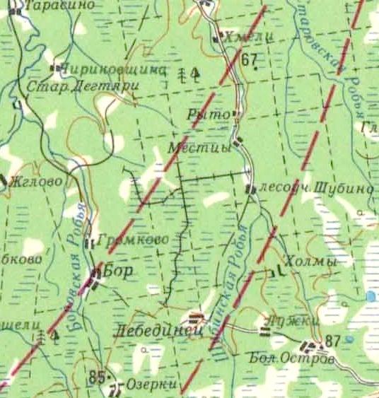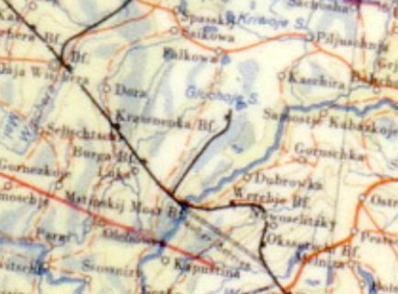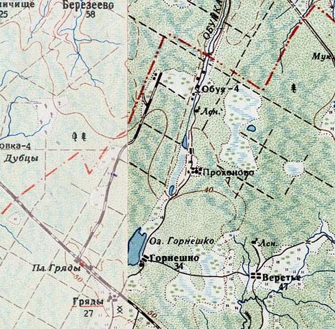 изданной в 1999 году (обозначена разобранной, обозначена не полностью). По информации от А. Корсакова, приблизительно с 1945 по 1955 годы действовала лесовозная узкоколейная железная дорога, пролегавшая от станции Дубцы в южном направлении. На узкоколейной железной дороге работали мотовозы, также применялась конная тяга.