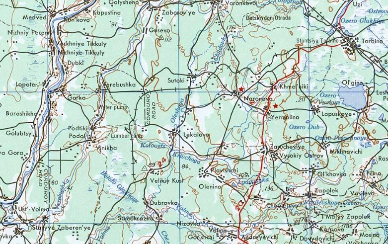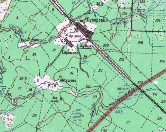Дубцевская (?) узкоколейная железная дорога. Начальный пункт — посёлок Суворовка, расположенный у станции Дубцы на железнодорожной линии Чудово — Окуловка.