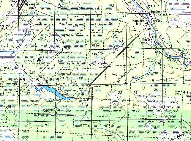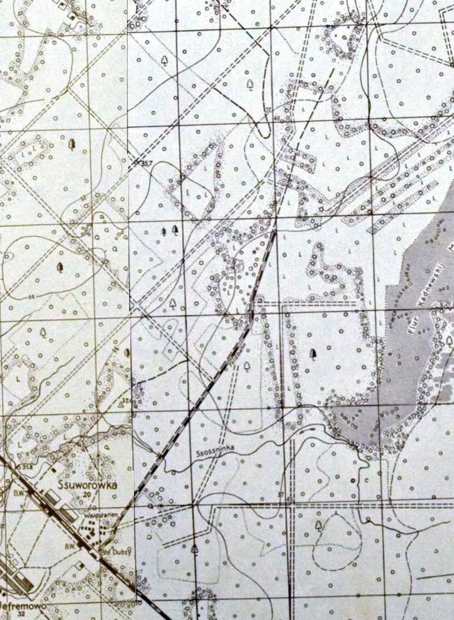 изданной в 1986 году (нанесена условно). Единственным источником информации об этой узкоколейной железной дороге является топографическая карта масштаба 1:25 000 (в 1 сантиметре — 250 метров), изданная в 1943 году для нужд германской армии. Возможно, узкоколейная железная дорога предназначалась для вывоза дров.