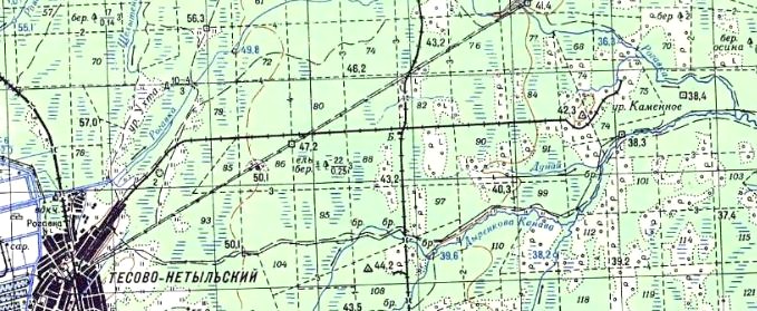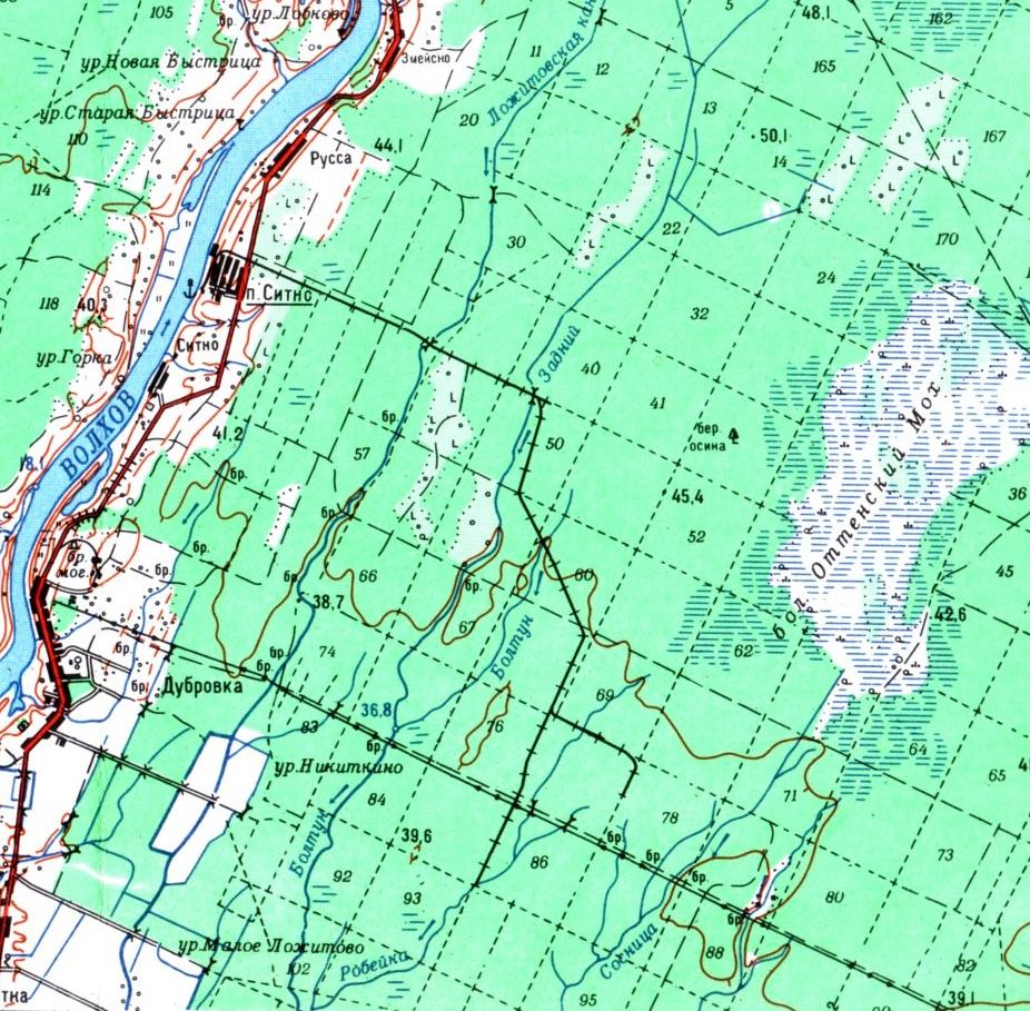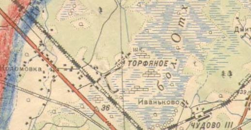 изданной в 197? году (обозначена разобранной). В посёлке Торфяное (станция Торфяное на магистральной железнодорожной линии Чудово — Тосно) находилось небольшое торфопредприятие. По информации от А. Корсакова, в 1930-х годах здесь была построена узкоколейная железная дорога, использовавшаяся для вывоза кускового торфа к перегрузу на широкую колею.