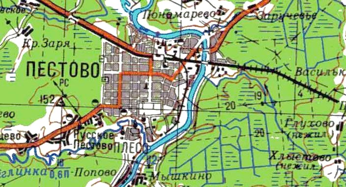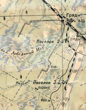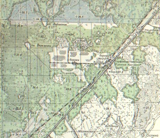В том месте, где на карте показано «депо», находился торфобрикетный завод. Узкоколейная железная дорога на топографической карте масштаба 1:100 000, изданной в 1987 году (основная часть), 1978 году (западная часть)