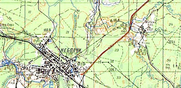 масштаба 1:100 000, изданной в 1989 году. Единственный источник информации об этой узкоколейной железной дороге — топографическая карта масштаба 1:200 000, изданная в 1942 году. Согласно данной карте, узкоколейная железная дорога пролегала от станции Неболчи до деревни Белый Бычок (позднее исчезнувшей), её протяжённость составляла около 4 километров.