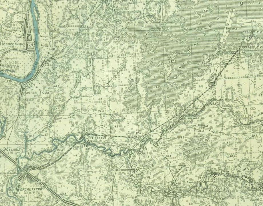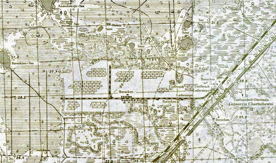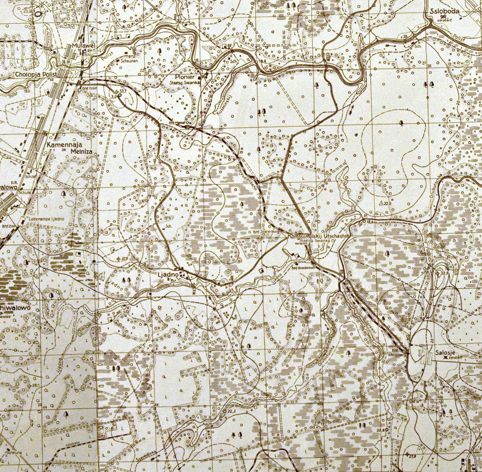 (нанесена условно, на основе данных карт, изданных в 1940-е годы). Узкоколейная железная дорога на топографической карте масштаба 1:25 000 (в 1 сантиметре — 250 метров), изданной в 1943 году для нужд германской армии