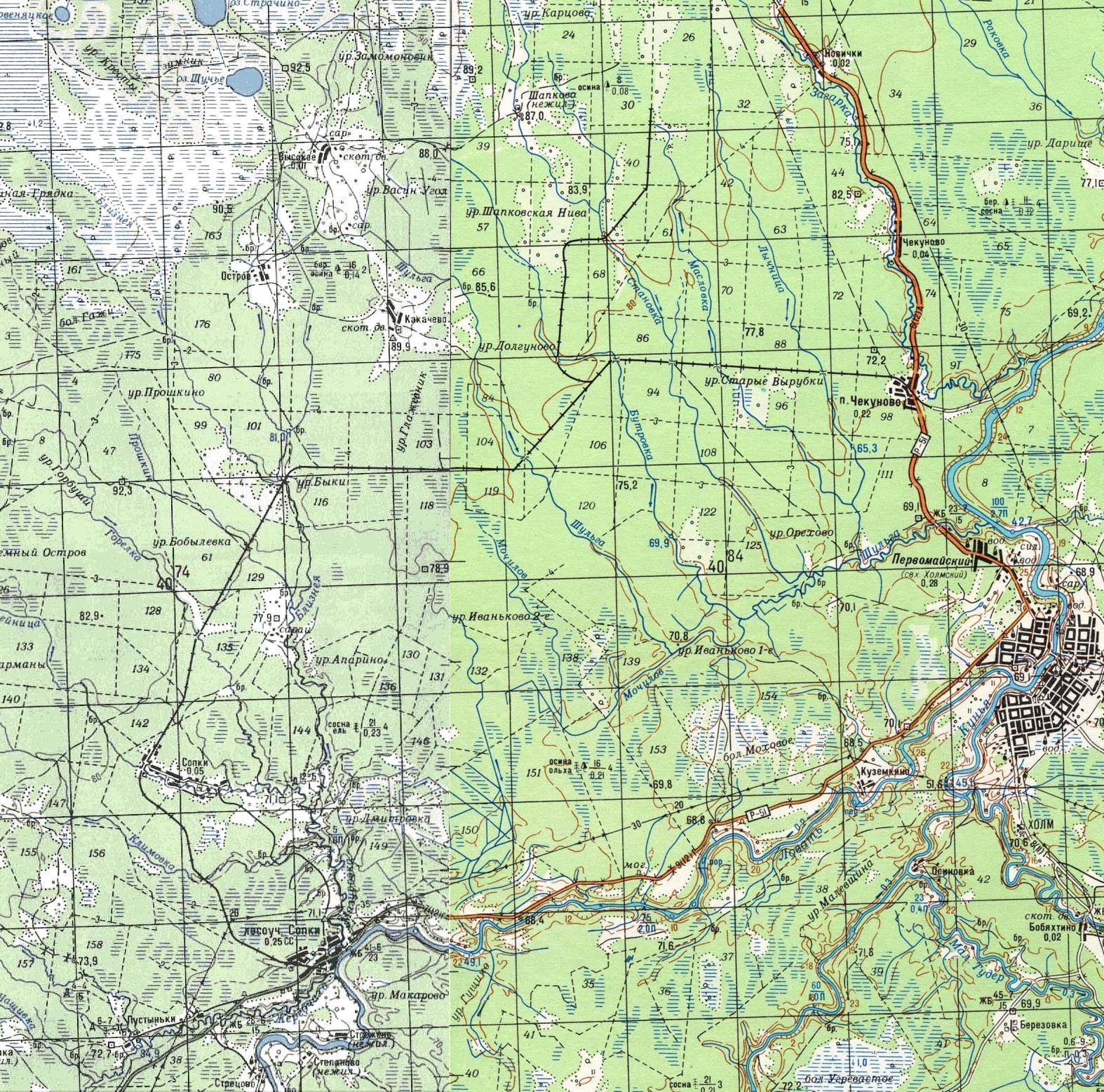 Узкоколейная железная дорога на топографической карте масштаба 1:500 000, изданной в 1979 году. Узкоколейная железная дорога на топографической карте масштаба 1:200 000, изданной в 1988 году