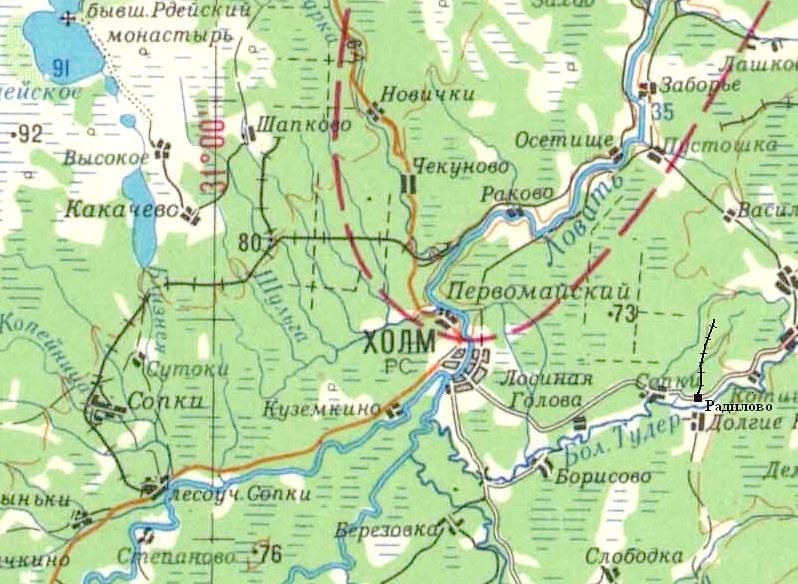 Радиловская (?) узкоколейная железная дорога. Начальный пункт — посёлок Радилово, расположенный на левом берегу реки Большой Тудер (начальный пункт узкоколейной железной дороги находился на правом берегу реки, напротив посёлка).