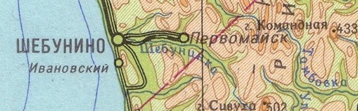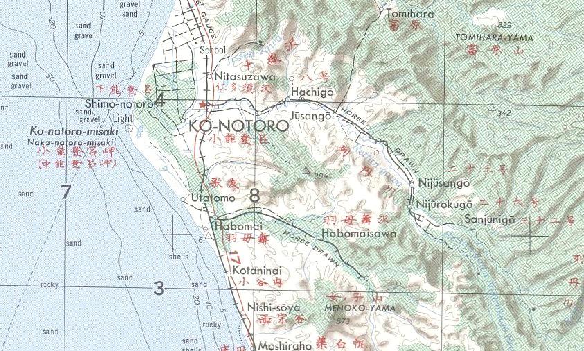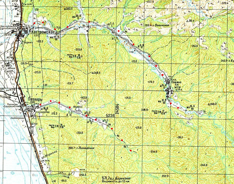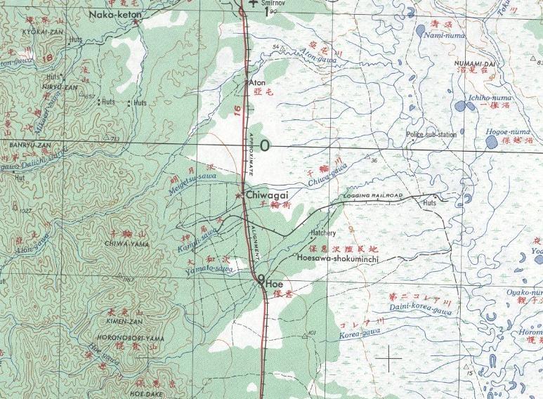 в 1985 году (нанесены условно, на основе данных предыдущей карты). Единственный источник информации об узкоколейных железных дорогах в окрестностях посёлков Костромское (Ко-Ноторо) и Пионеры (Хабомай) — карта масштаба 1:250 000, изданная в США в 1953 году. Согласно данной карте, протяжённость узкоколейной железной дороги Ко-Ноторо — Нидзюрокуго (Павино) составляла около 16 километров, протяжённость узкоколейной железной дороги в окрестностях Хабомай составляла около 10 километров.